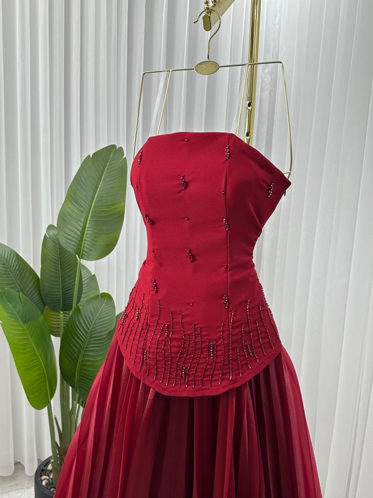 فستان سهره طويل احمر مورد ومطرز صدريه باربي تطريز جازار لمعه