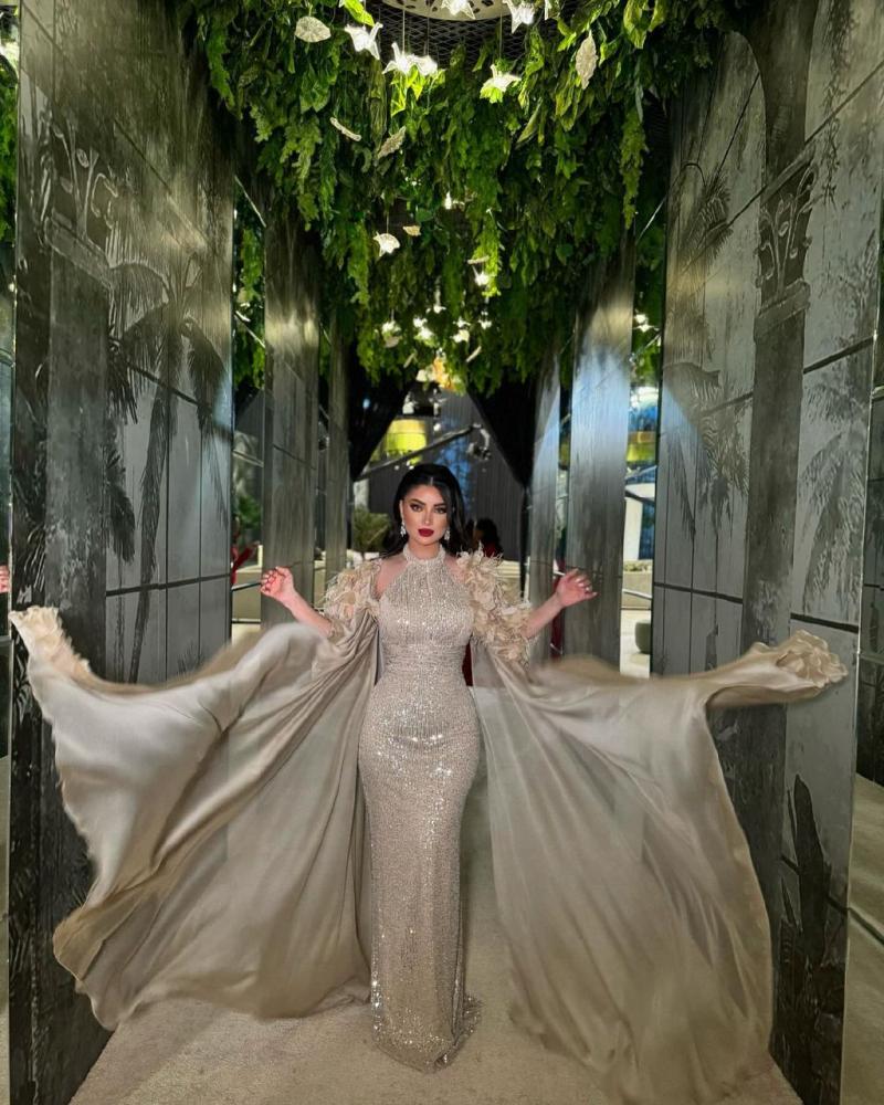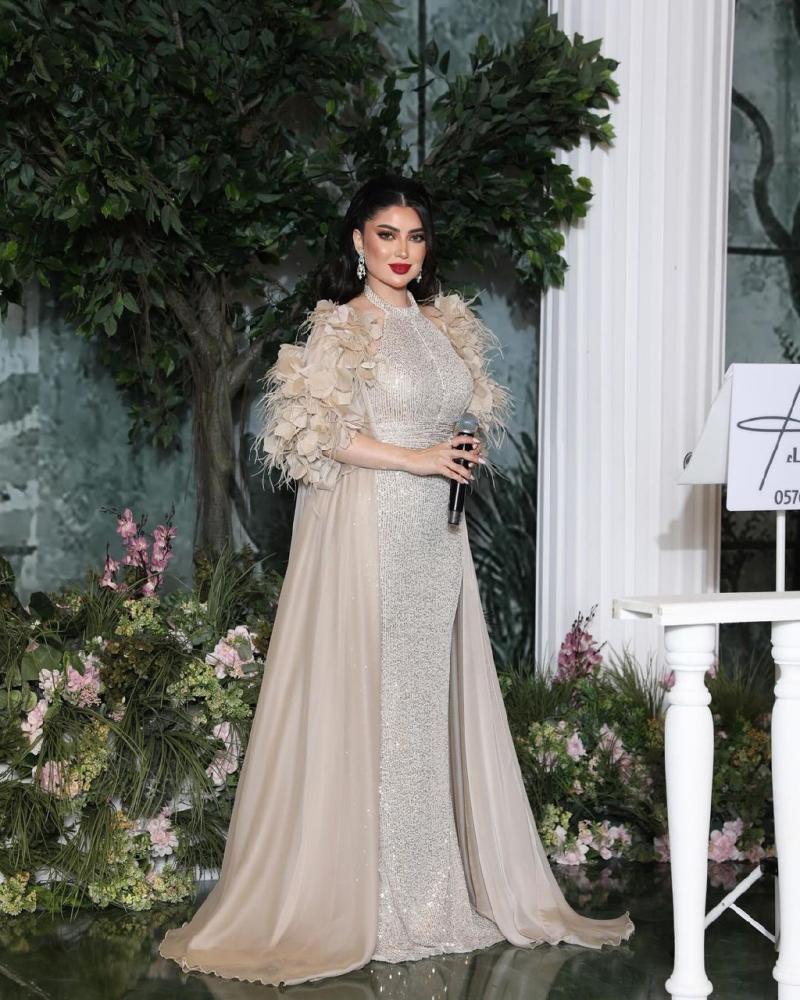 فستان سهره ترتر لمعه ذهب استرتش على أكمام حرير ناعم