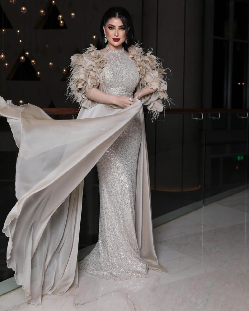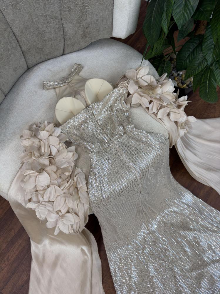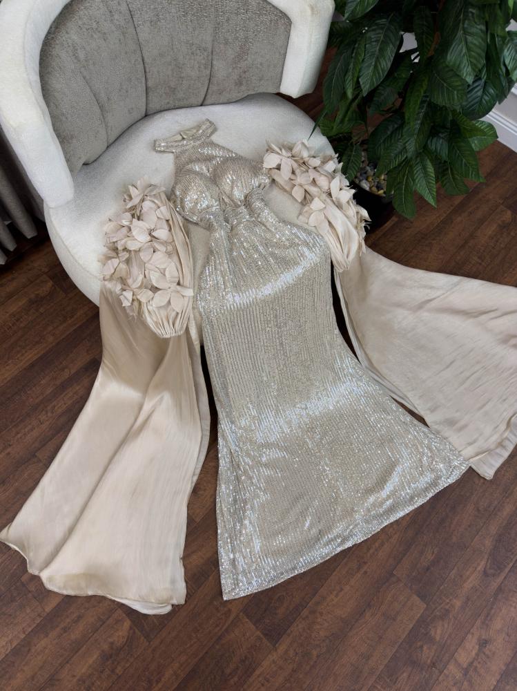 وصف الفستان / فستان سهره طويل انيق ترتر لمعه ذهب استرتش على أكمام حرير ناعم