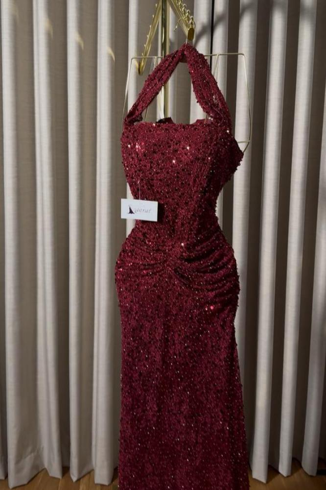 فستان سهرة طويل باللون الأحمر الداكن، يتلألأ ببريق ساحر بفضل التطريز اللامع الذي يغطي كامل الفستان. يتميز بتصميم أنيق يبرز منحنيات الجسم بشكل جذاب، مع حمالات رقبة رفيعة تضفي لمسة من الأنوثة والجاذبية. مثالي للمناسبات الفاخرة والحفلات الكبرى، هذا الفستان يمنحك إطلالة ملكية لا تُنسى.
