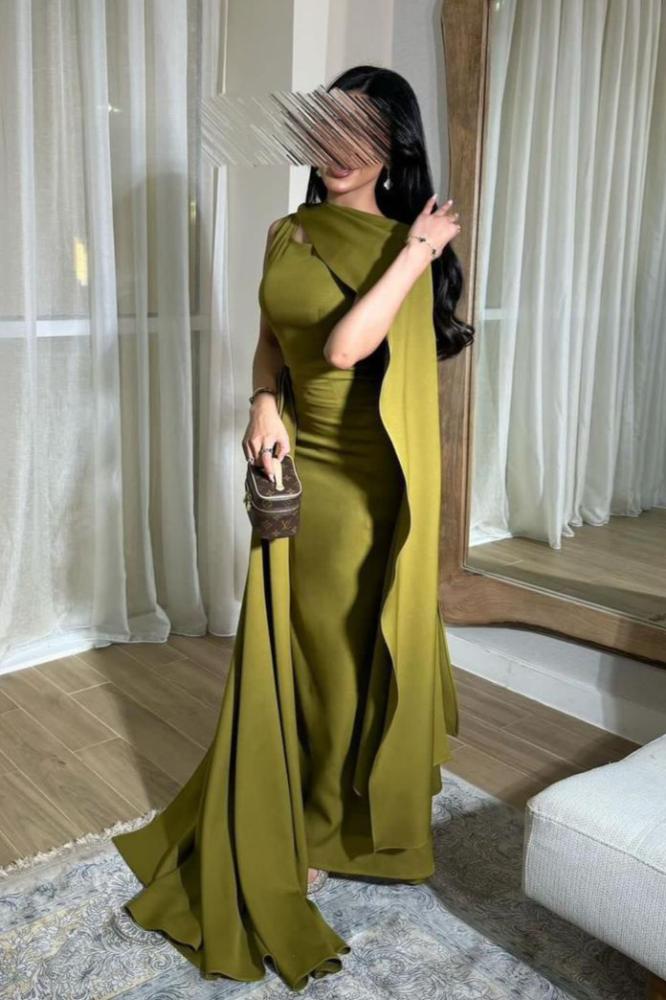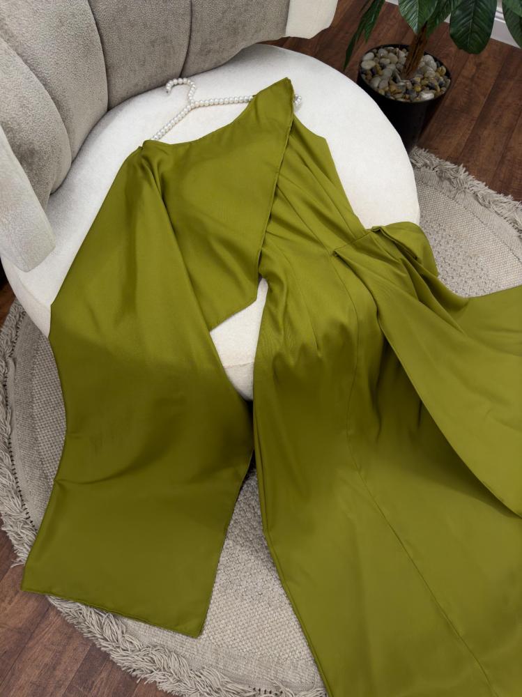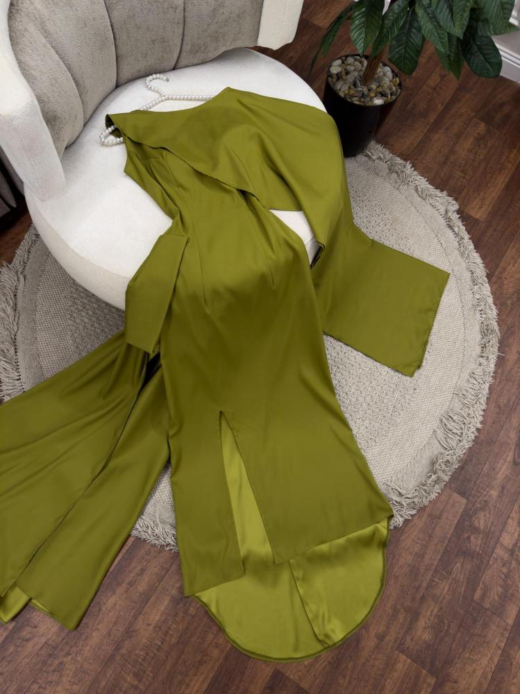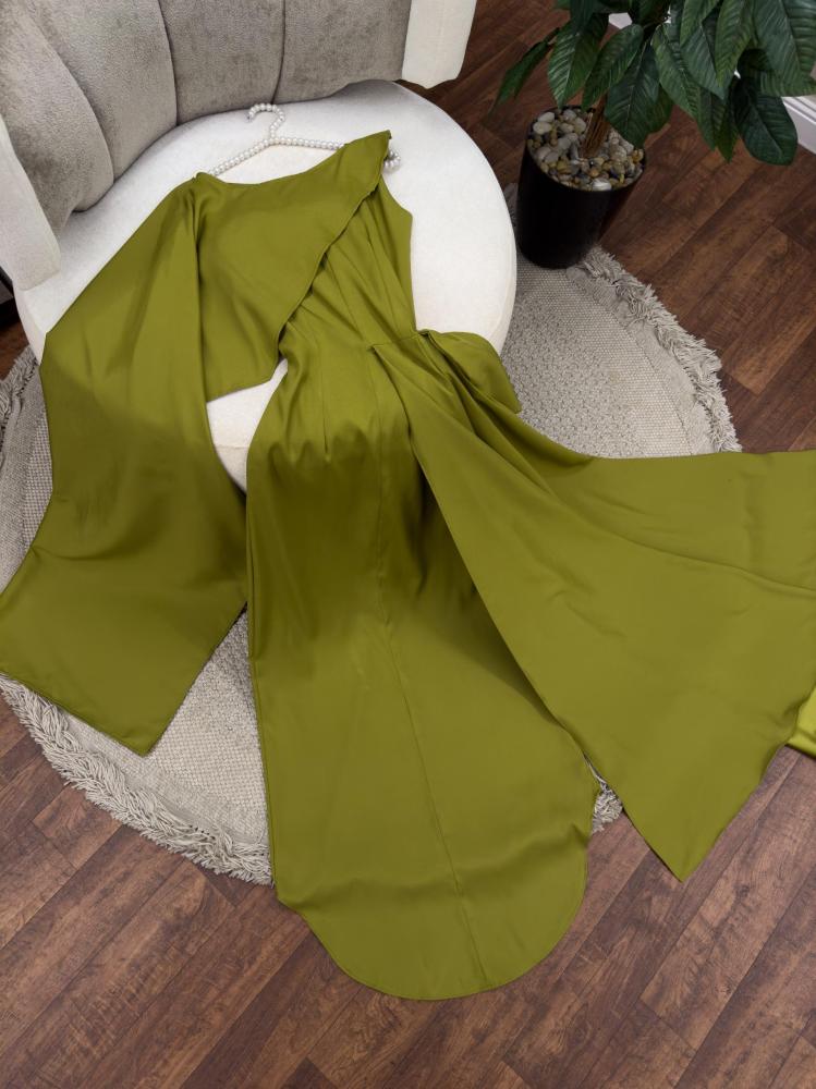 ✨ تفاصيل فستان أخضر زيتوني بأكمام واسعة وقماش طويل أنيق.