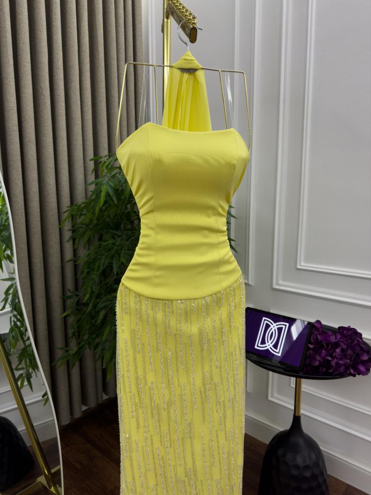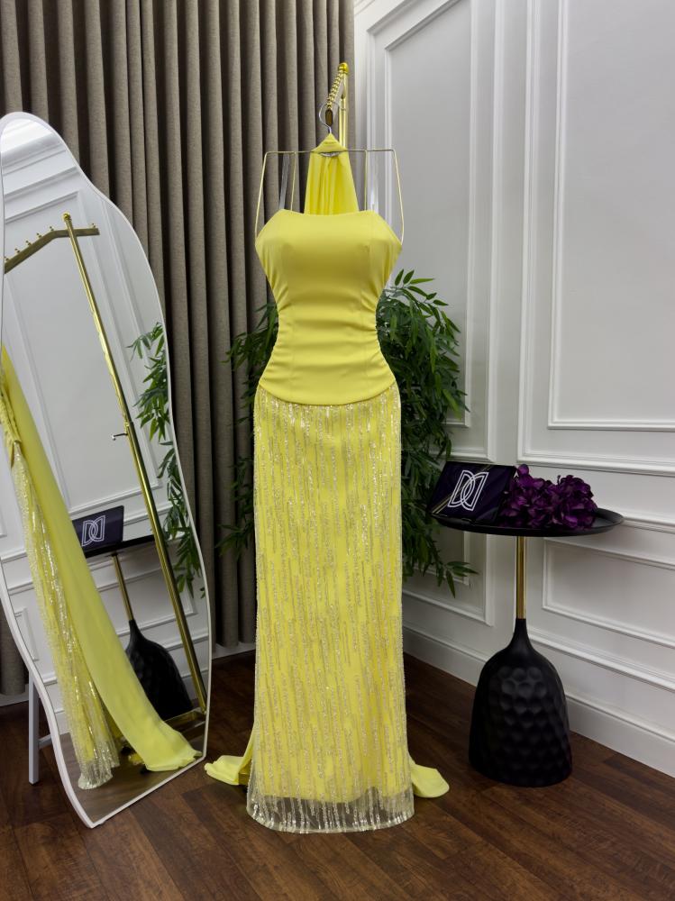 تألقي بإطلالة ساحرة مع هذا الفستان الأصفر الطويل المصمم خصيصًا للسهرات والمناسبات الخاصة. يتميز الفستان بجزء علوي أنيق بلون أصفر فاتح وقصة بدون أكمام تبرز جمال الكتفين، مع حمالات رفيعة تضفي لمسة رقيقة.