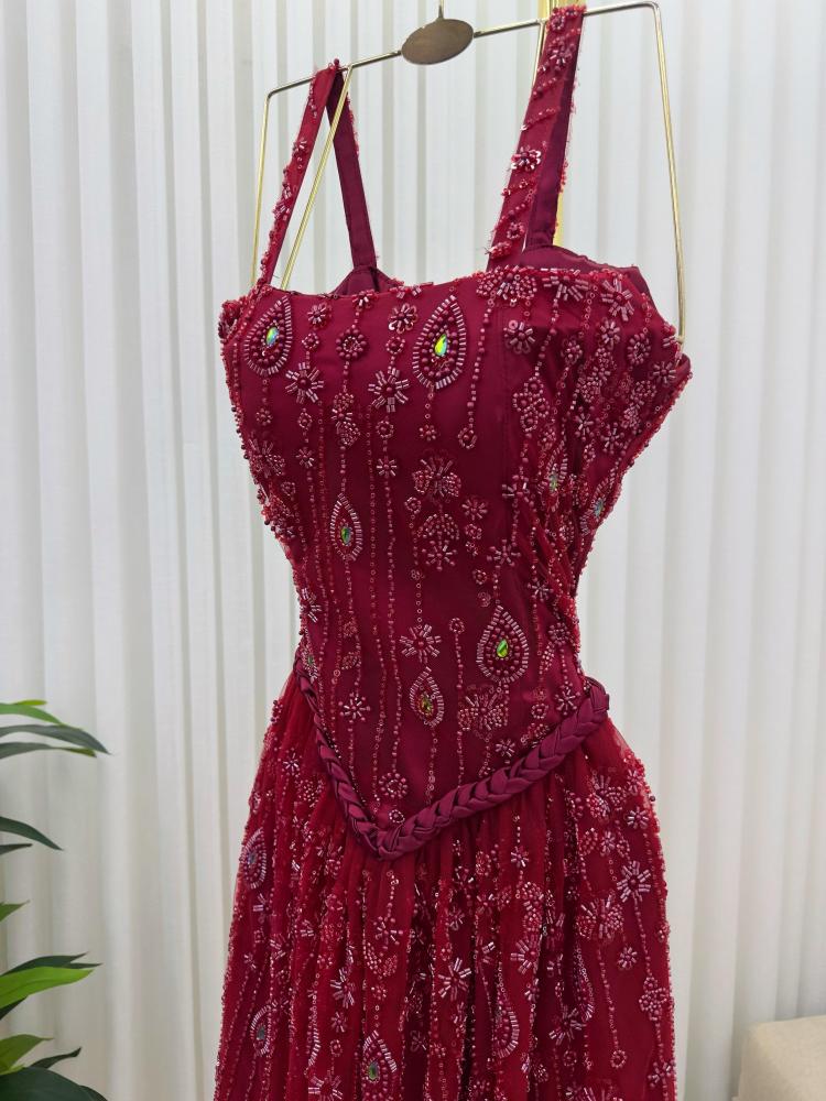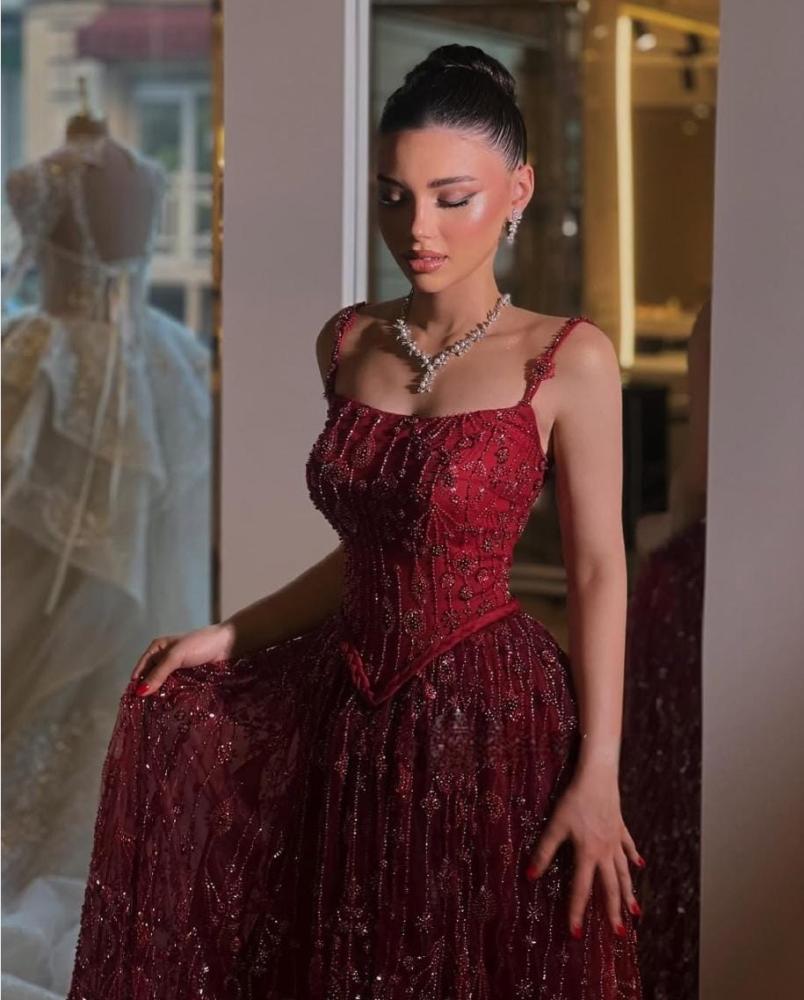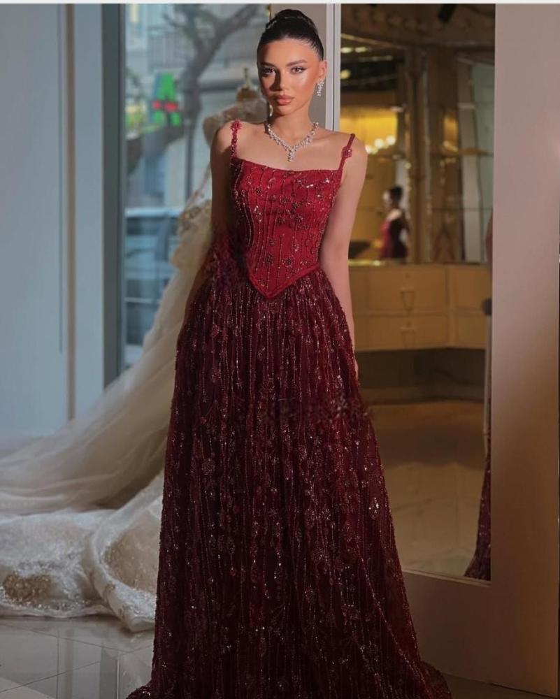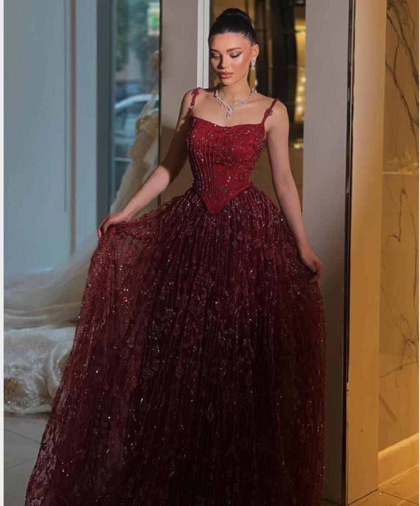 فستان سهرة فخم بلون خمري داكن، يتميز بتصميم كورسيه جذاب مطرز يدوياً مع تنورة واسعة مرصعة بالترتر اللامع، مثالي للمناسبات الرسمية والحفلات الراقية.