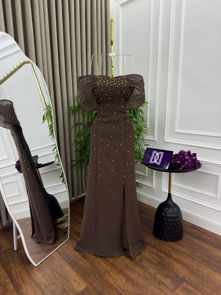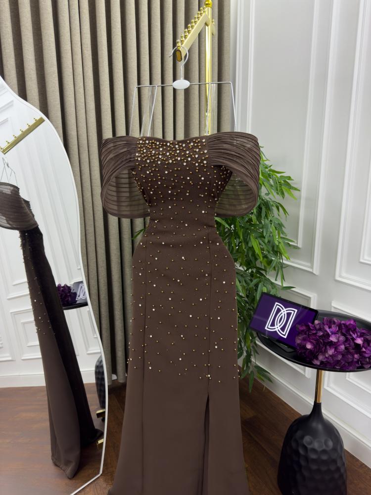 الجزء العلوي من الفستان مزين بترصيعات لامعة باللون الذهبي أو البرونزي تنتشر بأناقة، وتستمر هذه الترصيعات بشكل متناثر على طول الفستان. قصة الفستان ضيقة تبرز القوام، مع فتحة جانبية تضفي لمسة من الإثارة والأنوثة. لونه البني الداكن يجعله خيارًا فخمًا وغير تقليدي.
