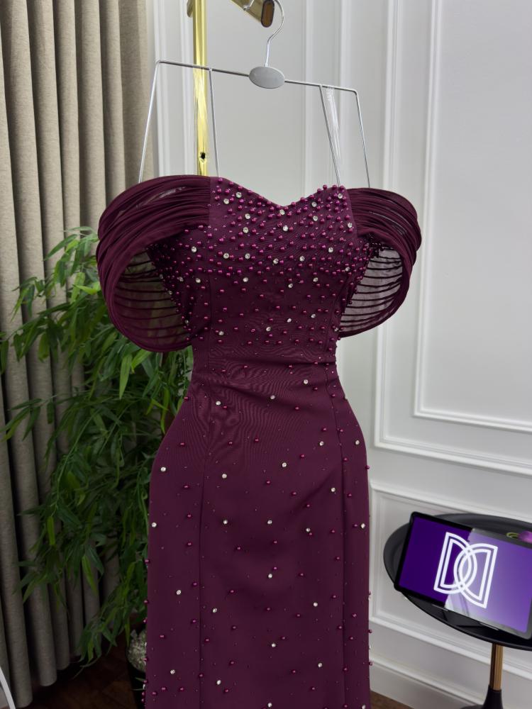 إطلالة تخطف الأنظار مع هذا الفستان البني الأنيق، المثالي للسهرات والمناسبات الراقية. يتميز الفستان بتصميم عصري مكشوف الأكتاف (أوف شولدر) مع تفاصيل أكمام متعددة الطبقات من قماش شفاف تضفي لمسة من الجاذبية والرقي.